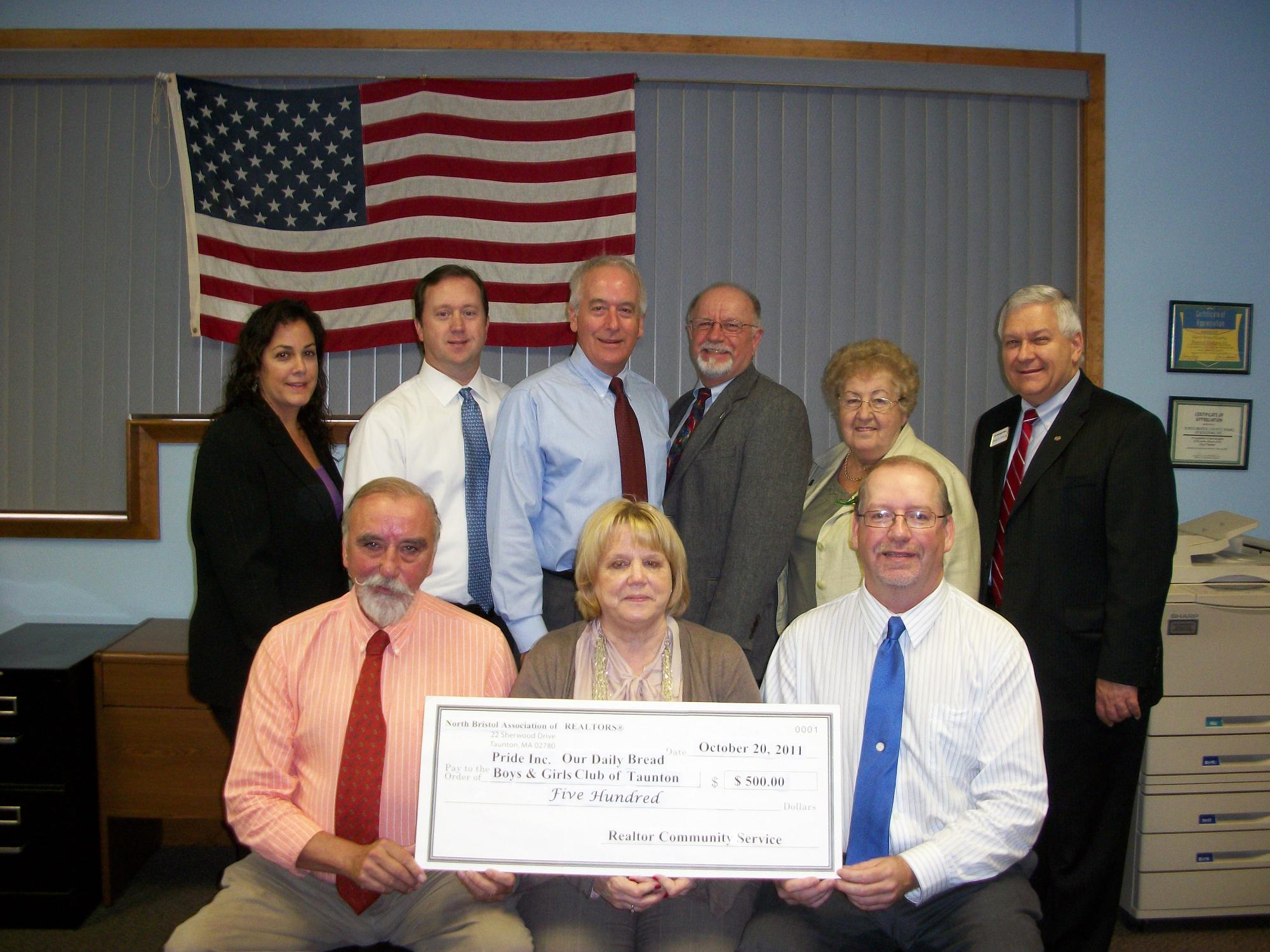 The North Bristol County Association of REALTORS Community Service Committee presented $500.00 donation checks to (Front row L to R) Doug Latham of Pride Inc., Wendy Berry of Our Daily Bread, and Bob McGarva of Boys & Girls Club of Taunton. Members of the committee pictured (Back row L to R) are Jennifer Oldfield, Chairman Mike Ballow,Marty Desjardins, Dave Curtis, Delores Kenney, and Dan LeBrun.